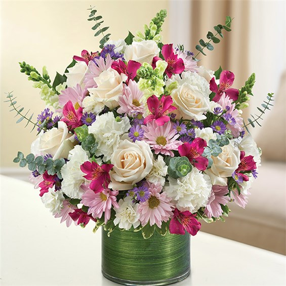 Sometimes all it takes is a simple gesture to bring back countless cherished memories. Our beautiful lavender and white sympathy arrangement filled with graceful lavender roses, alstroemeria and carnations, elegantly designed by hand in a graceful cylinder vase, is a touching tribute to a life well lived and the precious memories that will live on. •Arrangement of white roses, snapdragon and carnations, lavender daisy poms and monte casino and purple alstroemeria; accented with fresh greenery •Hand-designed by our expert florists in a stylish clear glass cylinder vase lined with a Ti leaf ribbon; vase measures 6"H •Large arrangement measures approximately 16"H x 17"L •Medium arrangement measures approximately 15"H x 16"L •Small arrangement measures approximately 14"H X 15"L •A lovely gift for the service or for the home of family members or friends •Our florists hand-design each arrangement, so colors, varieties and vase may vary due to local availability •Alstroemeria may arrive in bud form and will open to full beauty over the next 2-3 days