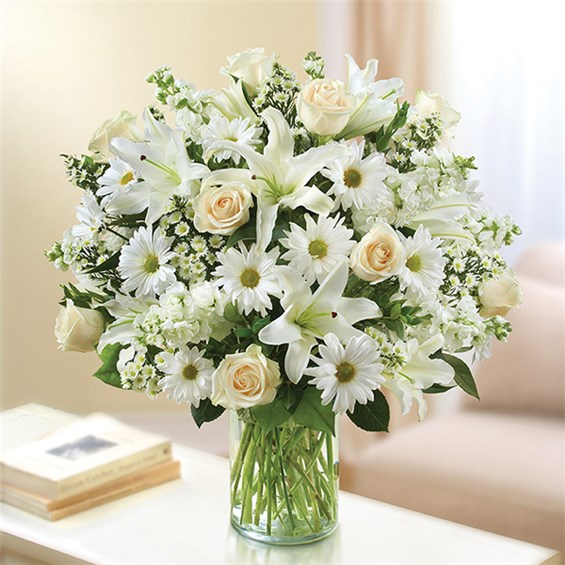 Express your sincere condolences with our elegant all-white arrangement of roses, lilies, stock, daisy poms and monte casino. A peaceful tribute that offers treasured memories of loved ones. Abundant bouquet of the freshest white roses, lilies, stock, daisy poms and monte casino, accented with variegated pittosporum, salal and myrtle Hand-designed by our expert florists in a classic glass cylinder vase; vase measures 8"H Can be sent to the home of friends, family members or business associates, or to the funeral service Large arrangement measures approximately 24"H x 22"L Medium arrangement measures approximately 22"H x 20"L Small arrangement measures approximately 20"H x 18"L Our florists hand-design each arrangement, so colors, varieties, and container may vary due to local availability Lilies may arrive in bud form and will open to full beauty over the next 2-3 days